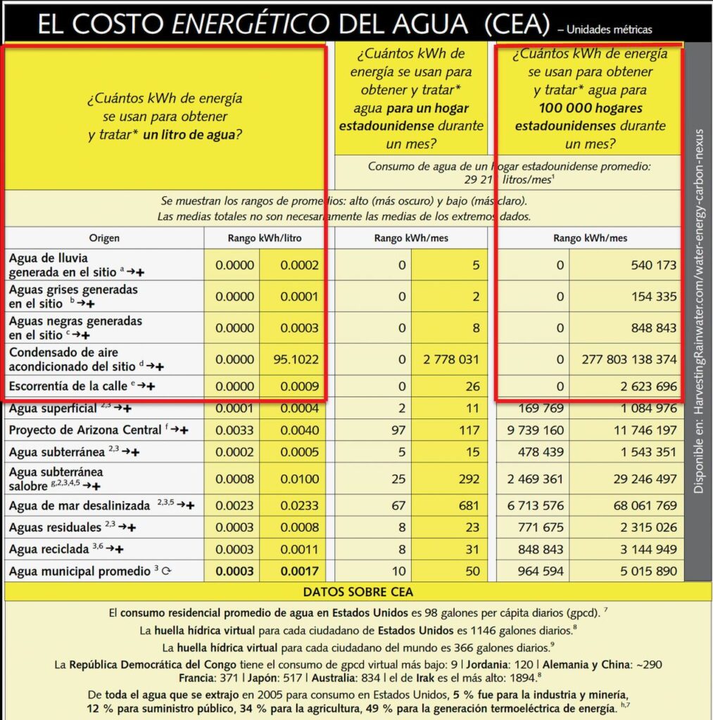 Observa las aguas típicamente gratuitas que hay en el sitio, señaladas dentro de los bordes rojos, especialmente el condensado del aire acondicionado, y cómo su costo energético puede variar de 0 kWh por galón/litro a 95 kWh por litro (360 kWh por galón). Un kWh es un kilovatio hora de energía.