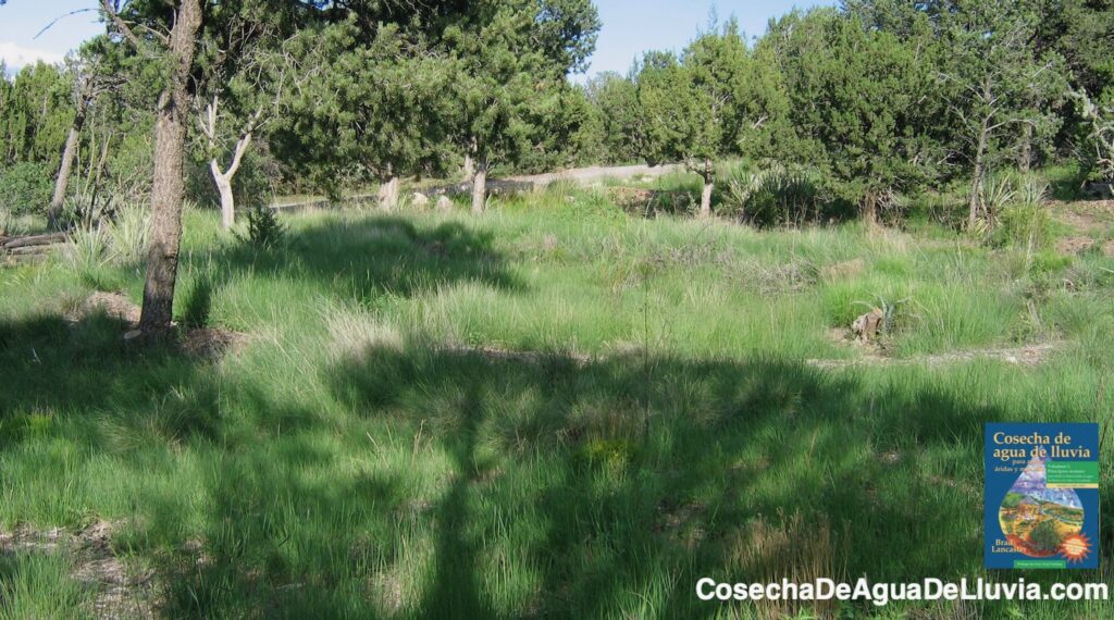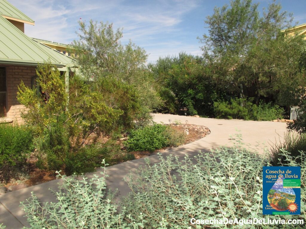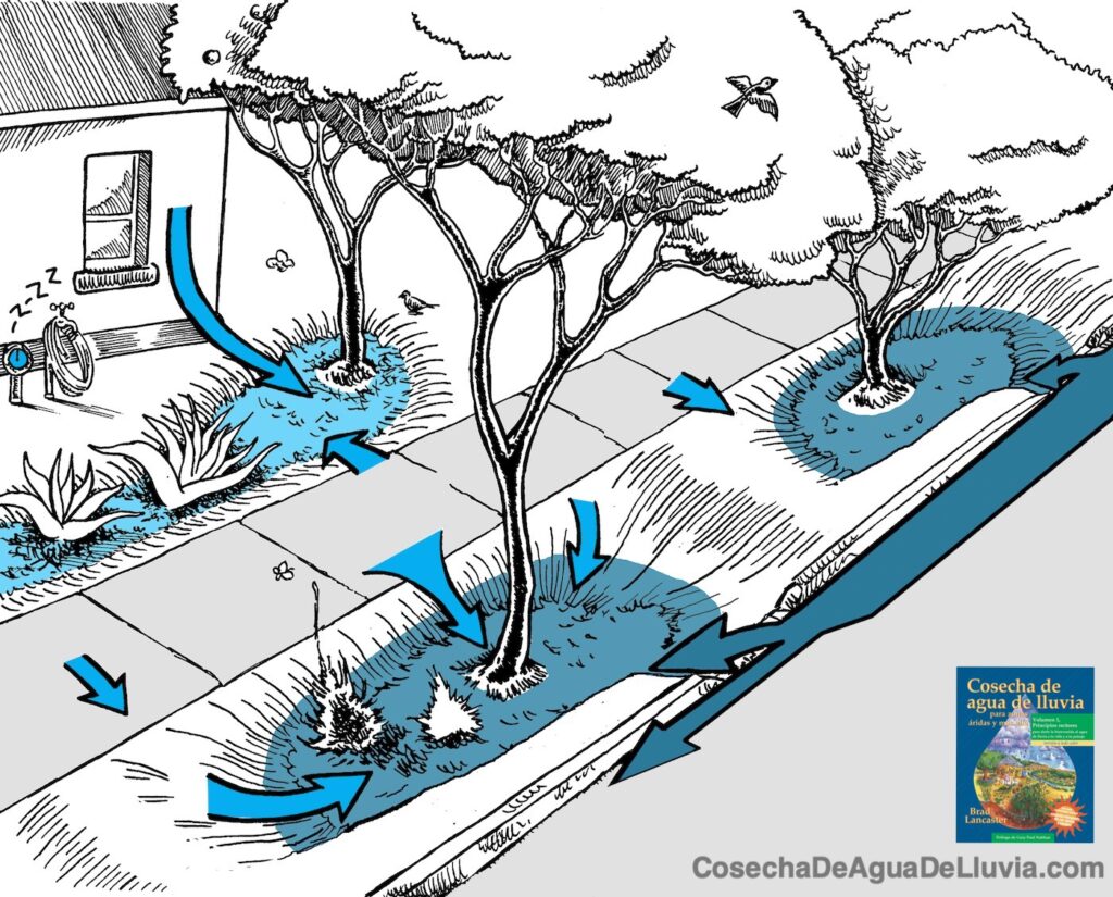 La lluvia, la escorrentía, las hojas caídas y la capa superficial del suelo se cosechan y se usan en el paisaje, lo que contribuye al control de las inundaciones y a una mejor calidad del agua.
