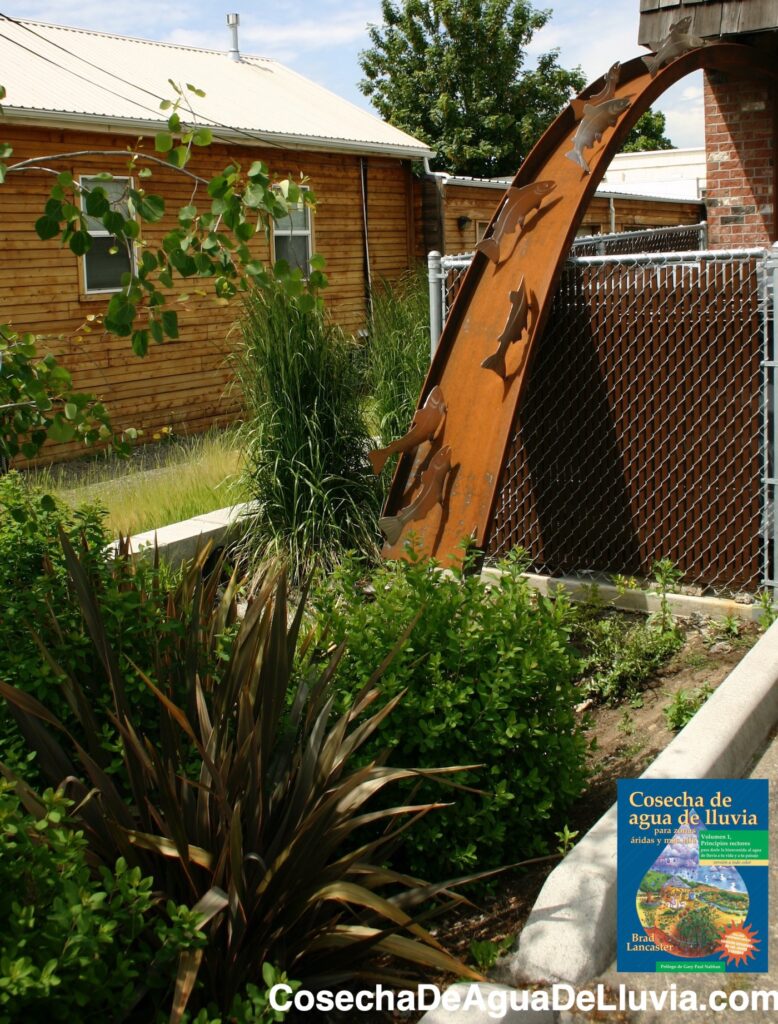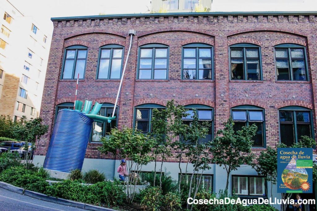 El agua entra por el dedo índice, el sobreflujo sale por el pulgar hacia los jardines en terrazas. Vine Street, Seattle (Washington).