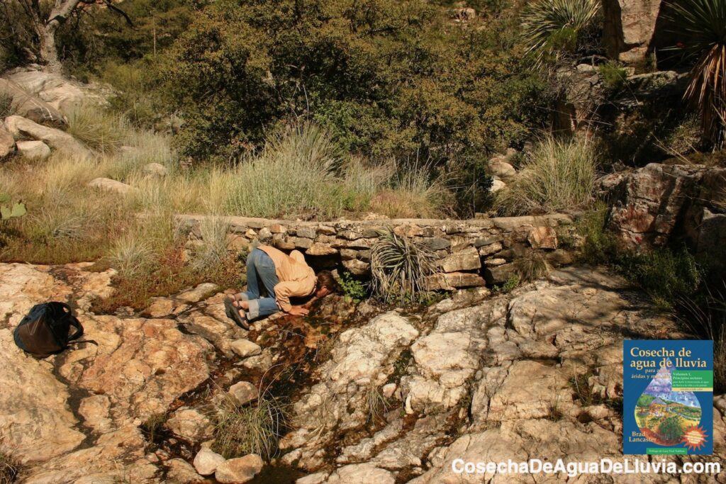 La cortina de piedra construida hace mucho tiempo sobre la roca madre desnuda ha acumulado una terraza nivelada de tierra y materia orgánica pendiente arriba de la cortina, en la que ahora crece vegetación. La tierra y la materia orgánica cosechadas actúan como un tanque de arena que infiltra rápidamente el flujo de aguas pluviales y luego lo libera lentamente hacia las raíces de las plantas, y como una filtración sobre la roca madre que sigue fluyendo por semanas después de la última lluvia. Anastasia Rabin disfruta un trago de esta agua sabrosa. Cañón Pima, Tucson (Arizona).