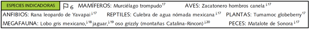 Una especie indicadora es una planta, mamífero, insecto, ave, pez, anfibio o reptil nativo cuyo papel en tu comunidad es muy parecido al de un canario en una mina de carbón. La disminución o el aumento de sus poblaciones refleja el declive o la mejora de la salud de una cultura, una comunidad de una cuenca hidrográfica y el ecosistema del que forma parte. El cambio en su población nos alerta de nuestra necesidad de ayudar a regenerar nuestro hábitat ecológico y comunidad mutuos (también puede ser señal de nuestro éxito en la regeneración). De este modo, salvamos y mejoramos la diversidad de vida de la que todos dependemos y disfrutamos. Por ejemplo, todas las especies enumeradas en la Evaluación de sitio en una hoja para Tucson (Arizona) solían ser más comunes a lo largo de los hábitats ribereños de nuestras corrientes de agua perennes y efímeras que ahora están en vías de desaparecer. Sin embargo, la Tumamoc globeberry está empezando a reaparecer en las cuencas de cosecha de escorrentía de la calle donde se ha sembrado bajo árboles de sombra nativos productores de alimentos.