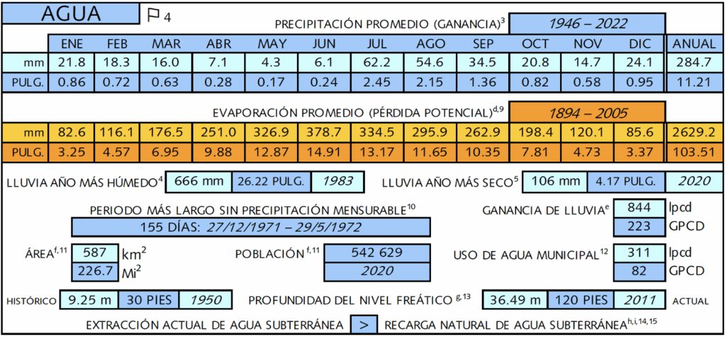 - Ingreso de agua por precipitación y uso municipal en galones per cápita/persona al día (GPCD) y en litros per cápita/persona al día (lpcd) para que puedas ver el potencial de la cosecha de agua de lluvia en tu comunidad (la precipitación en la superficie de la comunidad suele ser mayor que el consumo de agua de la comunidad).