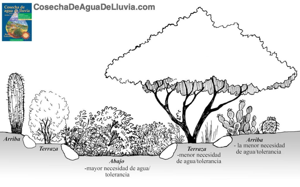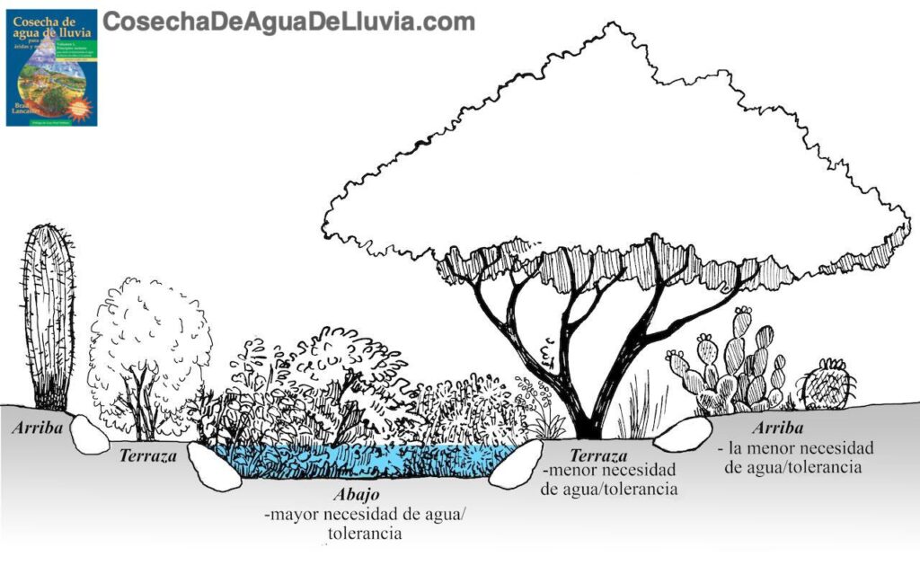Arriba – zona que se encuentra a lado de una cuenca o en sus orillas (y no dentro de la cuenca), donde las coronas de los tallos de las plantas permanecen altas y secas, pero las raíces pueden tener acceso al agua cosechada en la cuenca; parte superior de la berma. Es la más seca y cálida de las tres zonas (evita la acumulación de aire frío).
