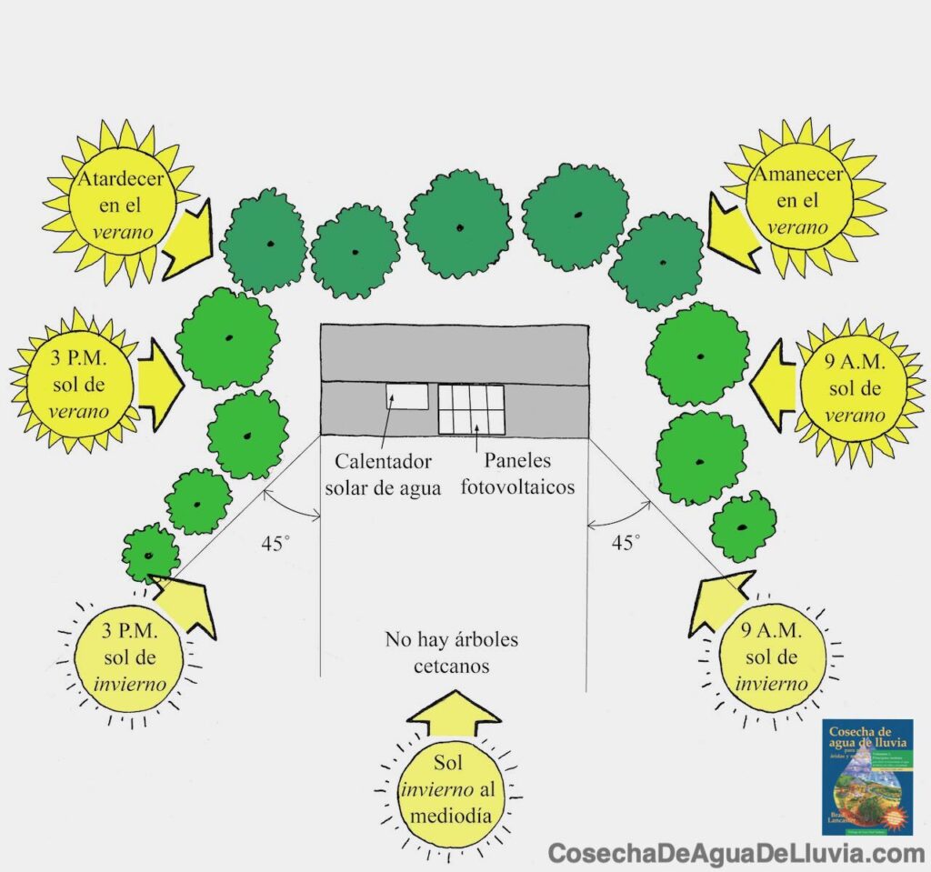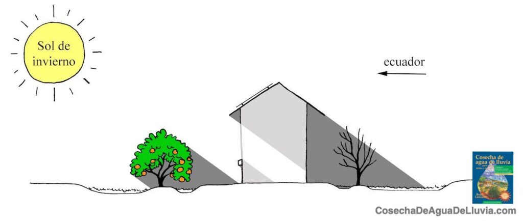 No se siembran árboles grandes en el lado del edificio cara al sol de invierno para mantener la ganancia solar en inverno para las ventanas cara al sol invernal, los paneles solares y el calentador solar de agua. Aunque esto se puede afinar seleccionando y colocando vegetación cuya altura en la madurez no bloquee el acceso deseado al sol de invierno (para más detalles, consulta “la proporción de sombras durante el solsticio de invierno” en el capítulo 4 de Cosecha de agua de lluvia para zonas áridas y más allá, Volumen 1).