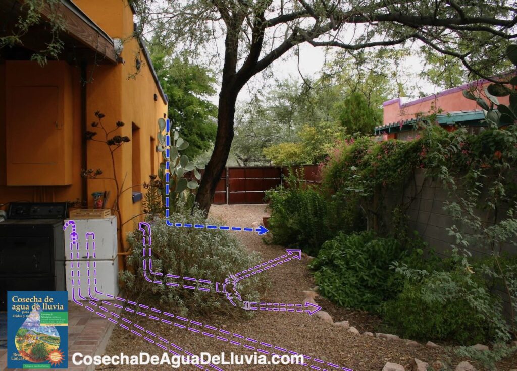 La escorrentía del techo se dirige a las cuencas a través de una bajante, seguida por un tubo (debajo del camino; mira la flecha de flujo azul punteada).