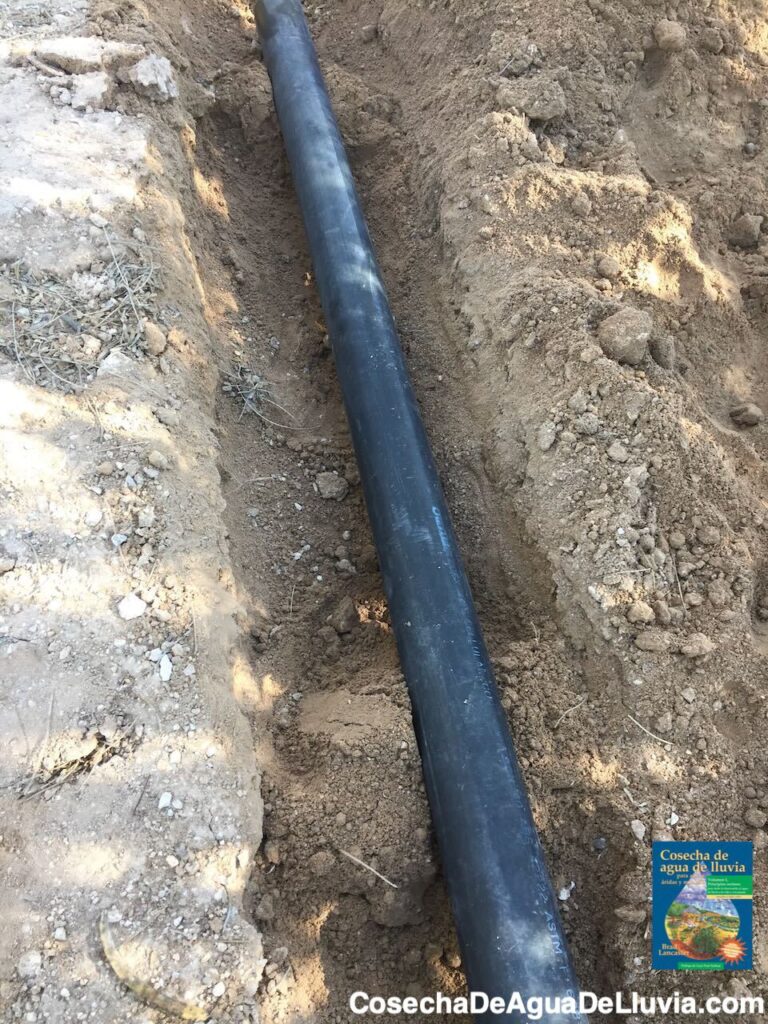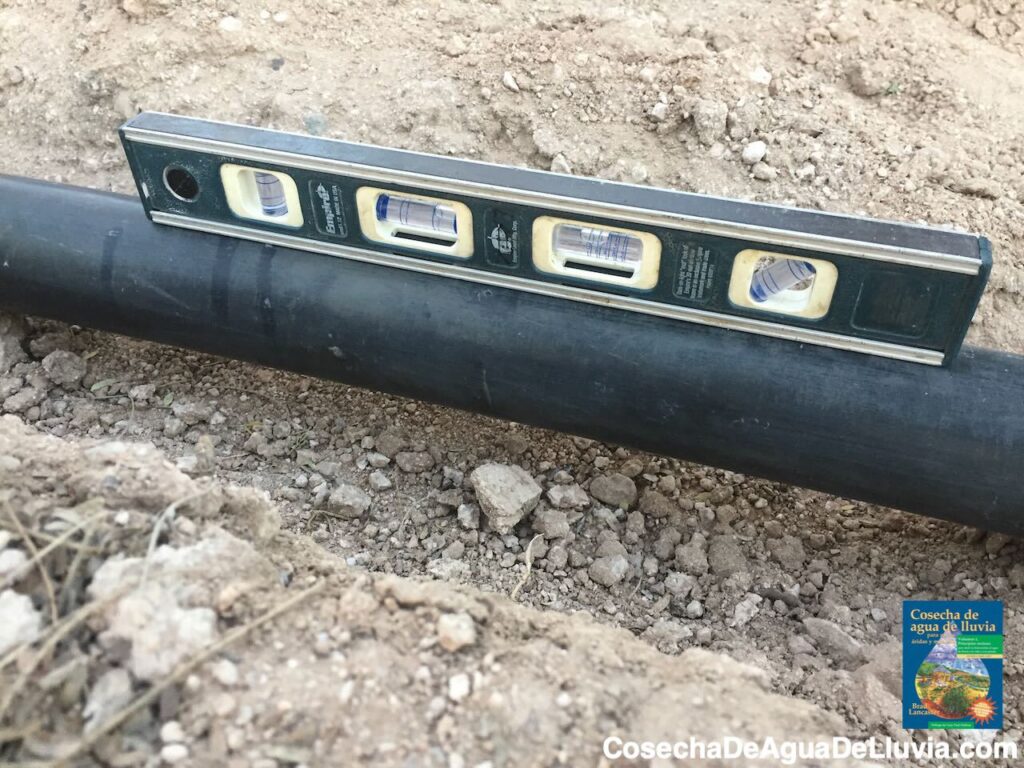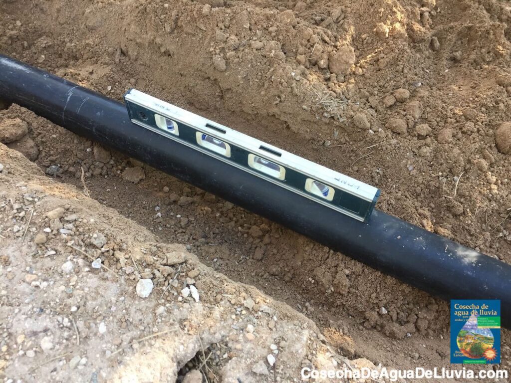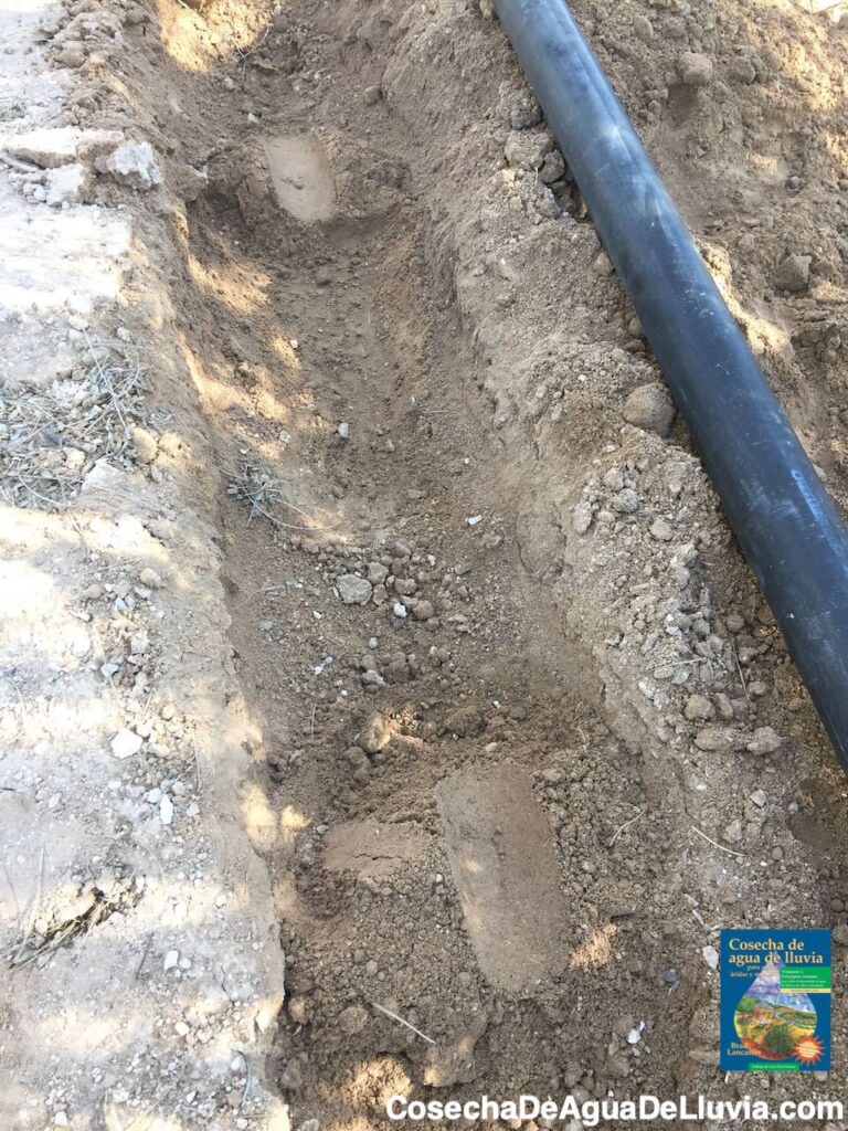Foto: Brad LancasterExcava profunda la zanja para la tubería, luego coloca la tubería sobre montículos de tierra dentro de la zanja, espaciados cada tres pies aproximadamente.