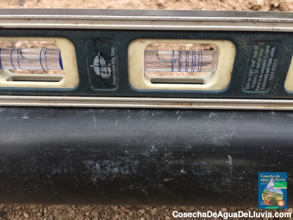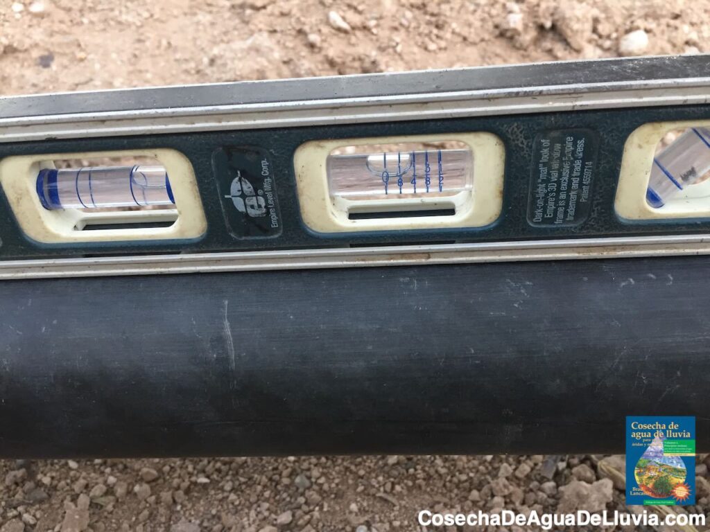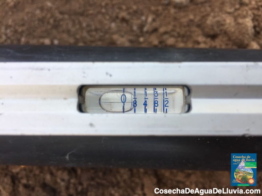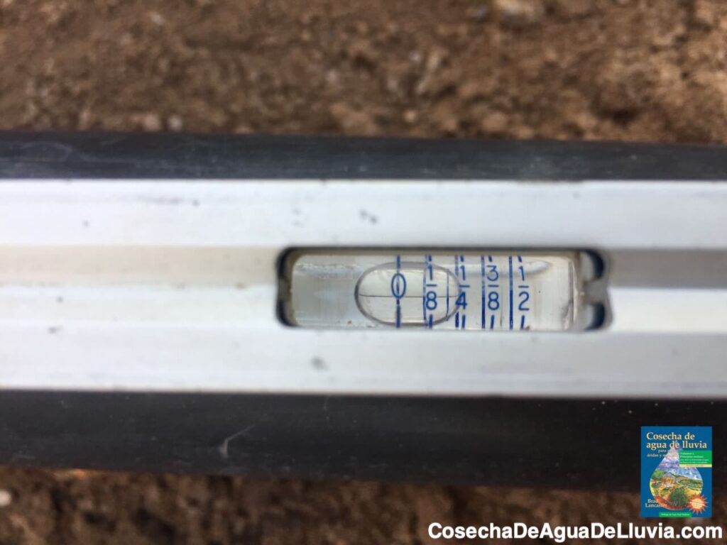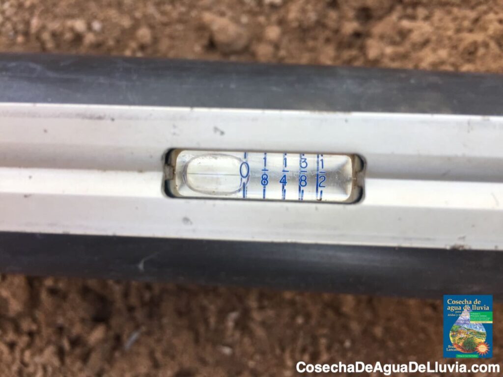 Foto: Brad LancasterEl nivel indica una caída de 1/4 de pulgada por cada pie lineal de caída/pendiente. Observa cómo la burbuja del tubo toca y marca 1/4 de pulgada.