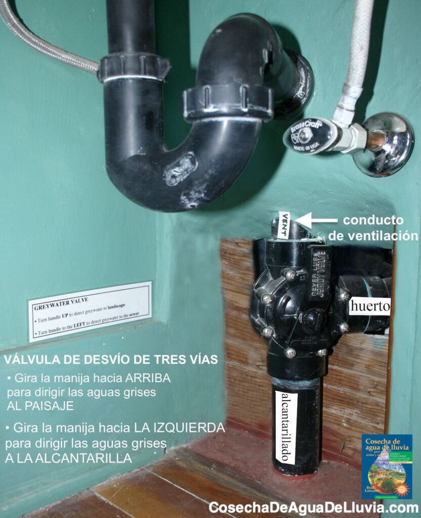 La válvula de tres vías permite dirigir las aguas grises al jardín o a la alcantarilla, dependiendo de las condiciones de humedad del suelo o de lo que se vierta por el desagüe.